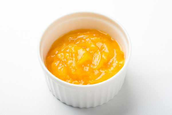 - 耐熱容器に②のオレンジの皮、砂糖、トレハ、オレンジの果汁を加えよく混ぜる。