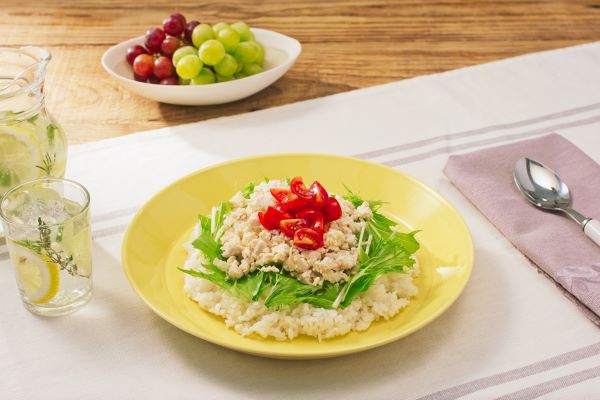 - 器にご飯を入れ、水菜、②、③を盛り付ける。