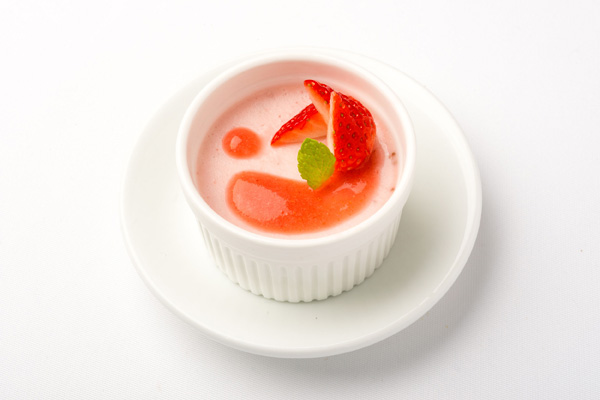 - いちごソースをかけて、切ったいちごとミント(分量外)を飾る。
